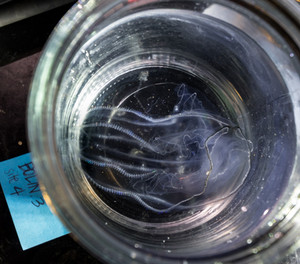 Ctenophores are uniquely fascinating invertebrates; while staring directly at one, it can seem to disappear in an instant! Nonetheless, Jacob helps keep a keen eye on these animals while studying their biochemical adaptations to high pressure. Despite their abundance throughout the sea, ctenophores are ironically difficult to capture and process. Extracting DNA from these watery balls of barely organized tissue is challenging. Often, researchers will photograph an animal before collecting, freezing, and then cautiously sampling its delicate tissues. Jacob needed a lot of samples for a new study of ctenophore cell membranes, and the bigger specimens the better.